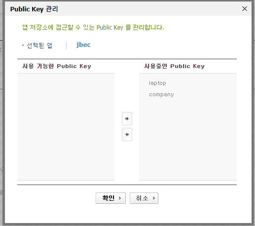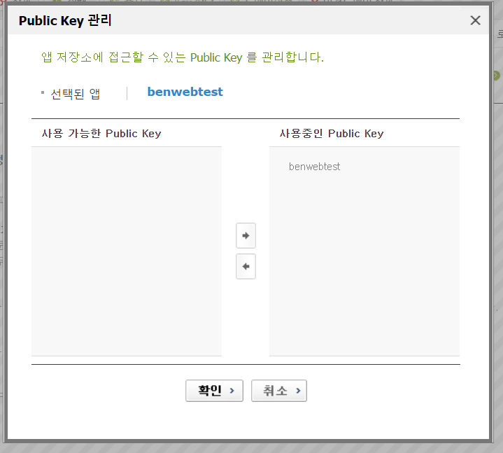 이미 등록해둔 키를 왼쪽에서 오른쪽으로 넘기고, 확인 버튼을 눌러 연결 합니다.