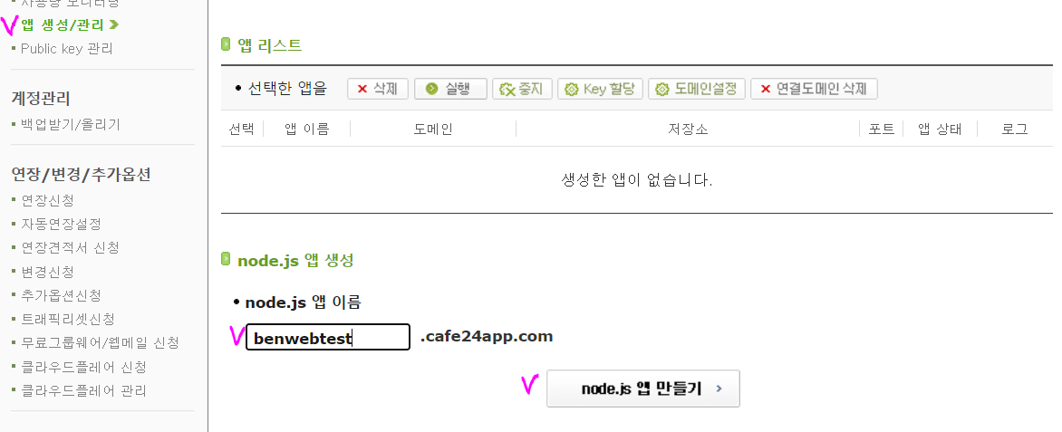 cafa24 에서 node.js 호스팅을 하고 app 을 생성하면, 해당 app에 접근하는 git repository 가 자동으로 생성되면, git 을 통해서만 source 를 개발 PC에서 cafe24 server 로 전달할 수 있습니다. 이 문서에서는 다음과 같은 작업을 소개합니다.