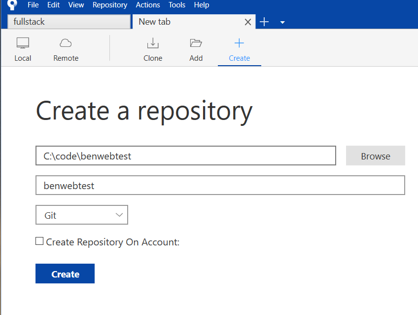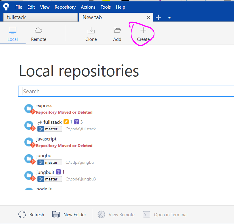 Sourcetree 를 열어서, 위에 + 버튼을 누르고 Create 버튼을 누릅니다.