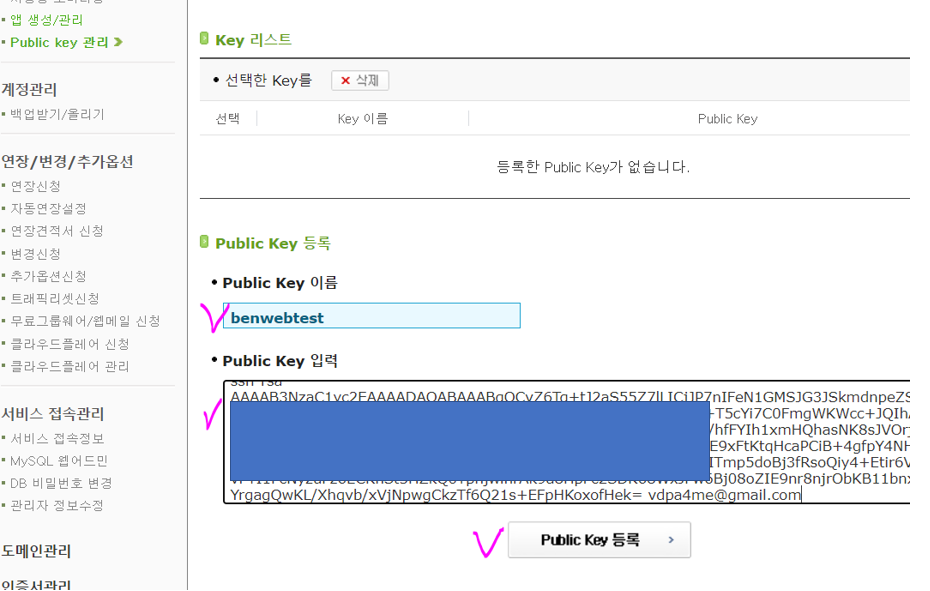 Cafe24 에서 Public key 관리 항목에 가서, SSH Public Key 를 등록 합니다. Key 이름은 아무것이나 넣어도 되는데, 알아보기 쉽게 "집 개발 PC" 같이 넣으면 확실히 구별 할 수 있을것 같습니다.