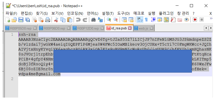 Key가 생성된 곳에 가서 public key 파일을 ("C:\Users\ben\.ssh\id_rsa.pub") 메모장으로 연다음 전체 값을 모두 복사합니다.