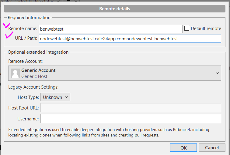 Remote name 은 아무거나 적어 주면 됩니다. URL 은 cafe24 의 나의 app 의 git 주소를 적어 주면 됩니다.
