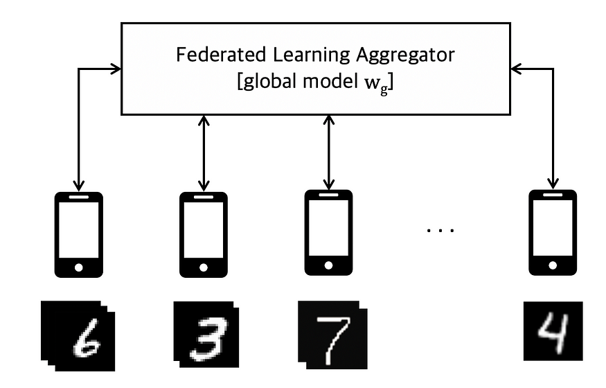 Non-IID 데이터란 클라이언트가 가지고 있는 각 데이터가 독립 + 동일한 확률 분포를 가지고 있지 않다는 의미이다. 스마트폰으로 예를 들면, 대한민국에 거주하고 있는 우리들의 앨범에는 동양인의 사진이 많을 것이다. 다양한 국가에서 FL을 수행하면 각각의 로컬 업데이트 값의 차이가 크게 생성된다. 아래 [그림 2]는 연합 학습에서 Non-IID 상황을 보여준다. 각 로컬 디바이스는 MNIST 데이터 셋의 특정 클래스 데이터만을 가지고 있다. 이런 상황에서도 Universial 한 MNIST Classifier를 만들 수 있을까? 이것이 연합학습이 직면한 문제 중 하나이다.