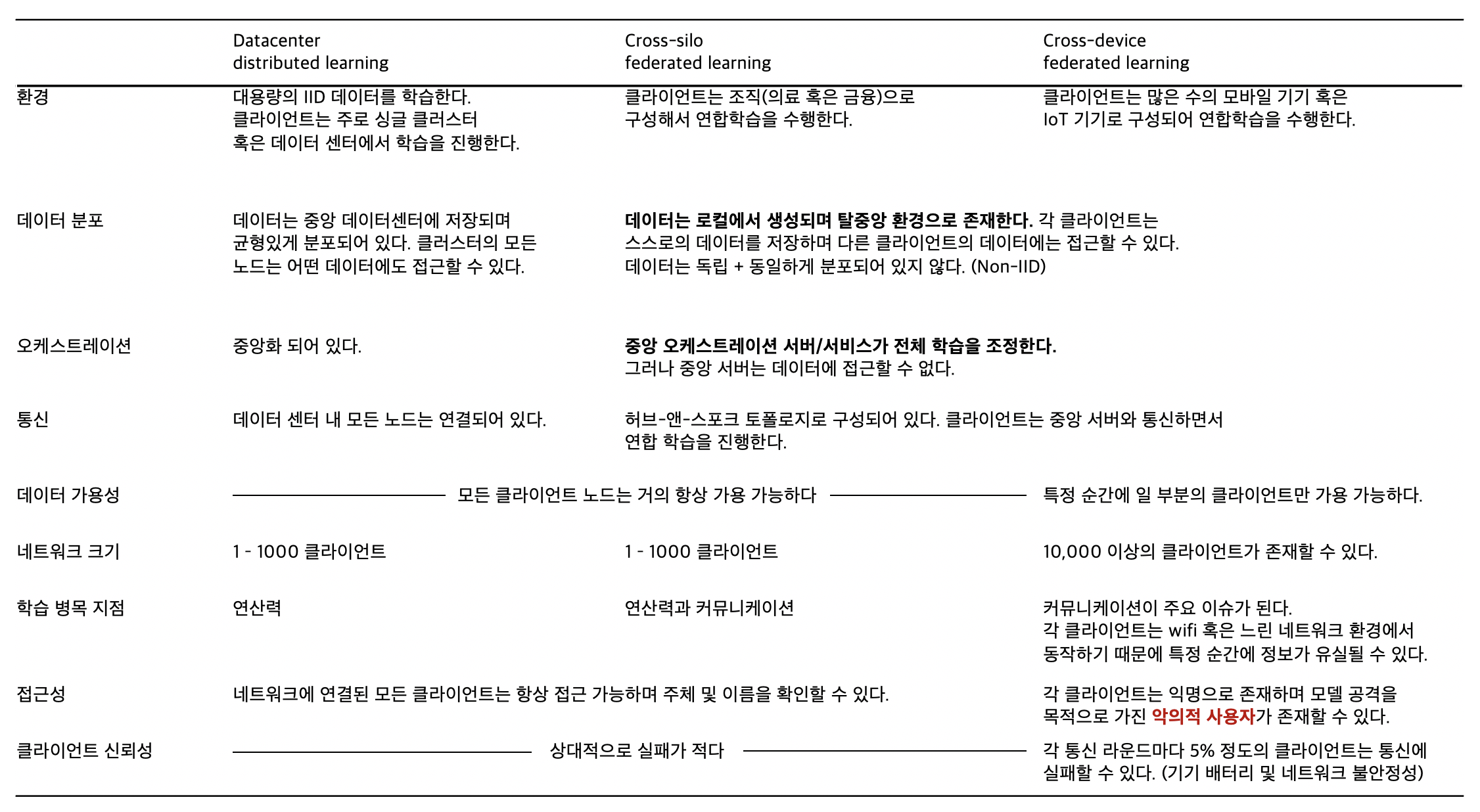 연합학습은 로컬 디바이스 혹은 공동체가 협업해서 학습한다. 기업 혹은 단체가 연합하는 것과 로컬 디바이스가 연합하여 학습하는 것은 상황이 조금 다르기 때문에 여기서는 용어를 분리한다. 전자를 Cross-silo FL이라 부르고 후자를 Cross-device FL이라 부른다. 분산학습이란 데이터가 분산서버에 저장 되어있는 환경에서 모델을 학습하는 상황을 말한다. [그림 2]는 이 세 가지 학습 환경의 특징을 표로 보여준다.