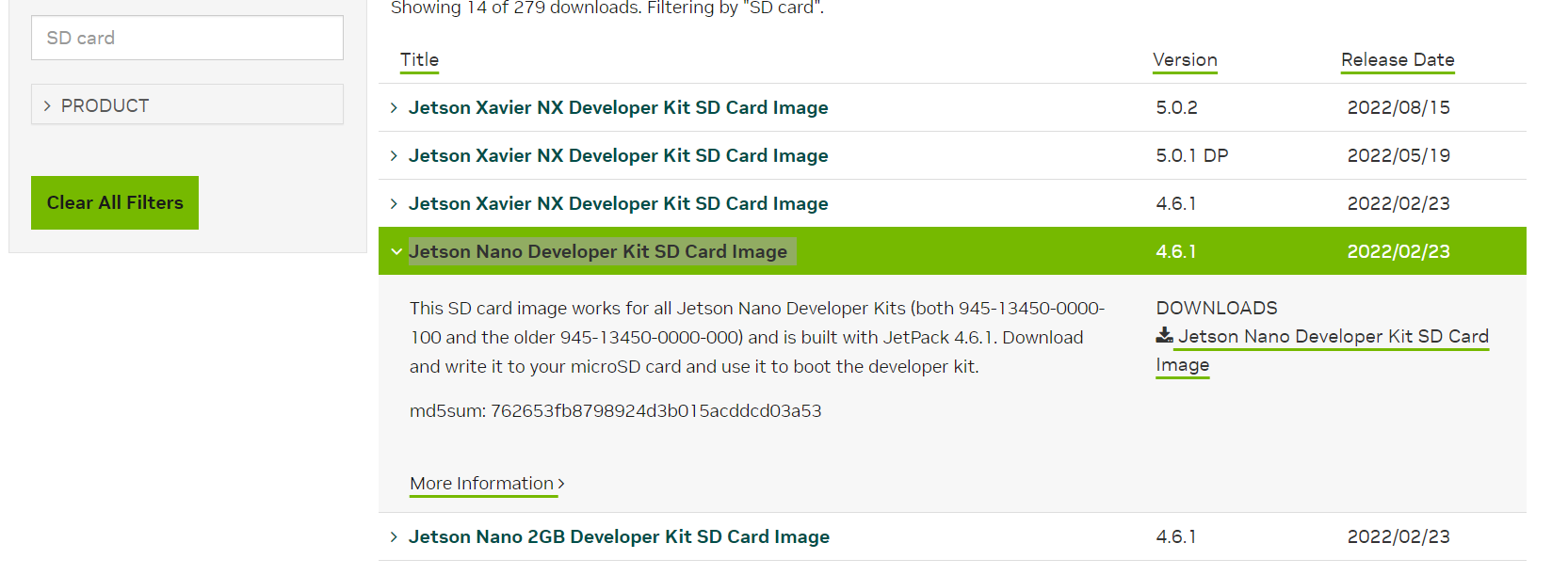 이곳에 가서 "SD Card Image" filtering 해보면 "Jetson Nano Developer Kit SD Card Image" 를 찾을 수 있음.