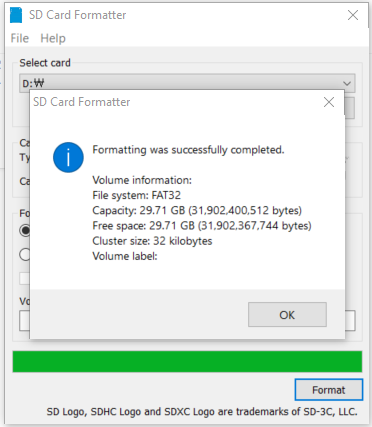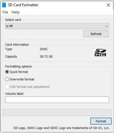 Formatter 를 사용하여 SD 카드 설정하고 Quick Format 진행