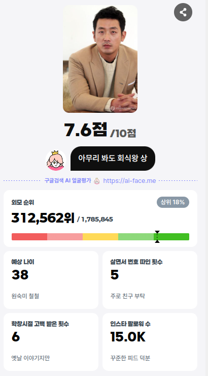 하정우님 - 상위 18%? - 뭐 연기파 배우이시니 - 정확하다고 생각됩니다.