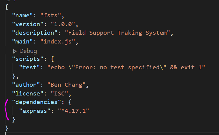 5. terminal 에서 npm install express 한다. 그러면 아래와 같이 dependencies 부분이 추가 된다.