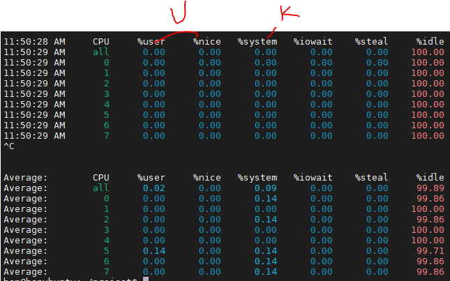 중간에 Ctrl+c 를 누르면, 평균 값이 저장 되며, sar은 종료 됨.