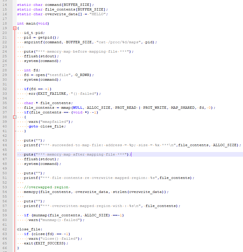 아래와 같이 file을 읽어 들이고 mmap() 함수를 통해 file mapping 을 하면, 파일의 내용을 메모리에 읽어 들여 그 영역을 가상 주소 공간에 매핑 할 수 있다.